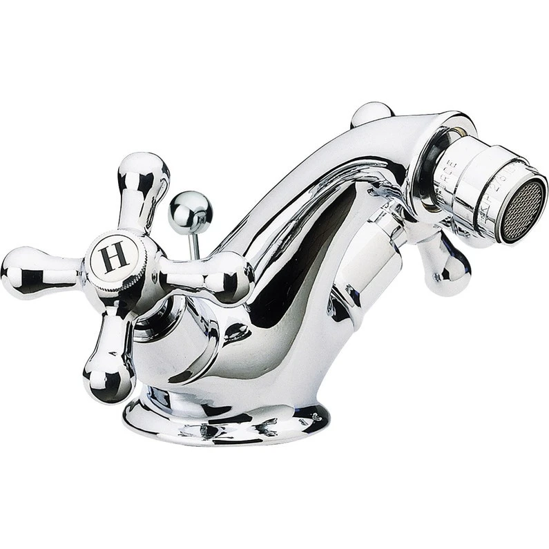 Mélangeur monotrou Bidet rétro bec fixe, équipé de têtes à disques céramiques 1/2 tour, croisillons métal, alimentation par flexibles inox M12/100 x F12/17 longueur 35 cm, fourni avec vidage à tirette en laiton, hauteur sous bec 70mm, saillie 120mm, chromé.
