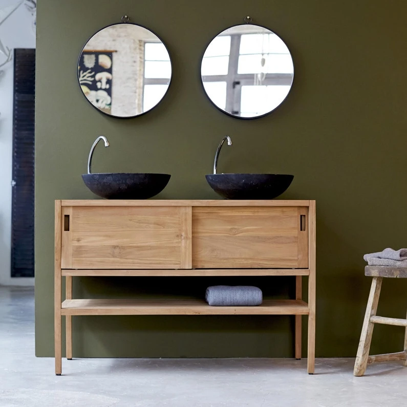 Découvrez ce meuble sous vasque en bois de teck de la marque Tikamoon ! Ce meuble de salle de bain en teck dispose deux portes coulissantes ouvrant sur une grande niche, ainsi qu’une niche ouverte. Notre élégant meuble sous vasque est idéal pour utilisation à deux de la salle de bain puisqu’elle pourra acceuillir jusqu’à 2 vasques. Grâce à son design élégant et épuré, il procurera un style moderne à votre salle de bain. Ce meuble en teck est un modèle signé Tikamoon, marque spécialiste du mobilier massif. Acheter un meuble Tikamoon, c’est acheter une pièce exclusive, dessinée avec passion par nos équipes.Concepteur de mobilier d’intérieur, Tikamoon propose des collections exclusives de meubles en bois massif.