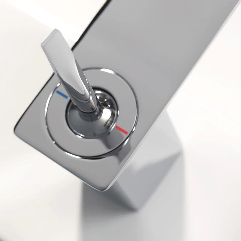 Mitigeur lavabo – modèle haut – avec flexibles d’alimentation. Levier «Joystick». Débit limité à 5 l/mn. Aérateur anti-calcaire intégré. Sans tirette. Bonde de vidage manuelle «Click» avec clapet couvrant.