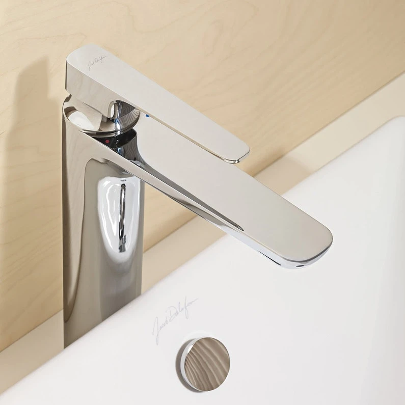 Mitigeur lavabo – modèle haut – avec flexibles d’alimentation tournants. Bague-limiteur de température. Aérateur anti-calcaire. Tirette latérale. Bonde de vidage en métal. Débit limité à 5 l/mn.