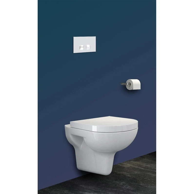 Ensemble bâti support Evo Régiplast+ cuvette suspendue sans bride Velvet. robinet flotteur silencieux, plaque de commande double débit 3/6 Litres. Installation de la plaque de commande en façade ou sur le dessus. Bâti support norme NF garanti 10 ans, testé pour une résistance à une charge de 400 KG. Réservoir anti-condensation. Cuvette suspendue Velvet sans bride, abattant frein de chute.